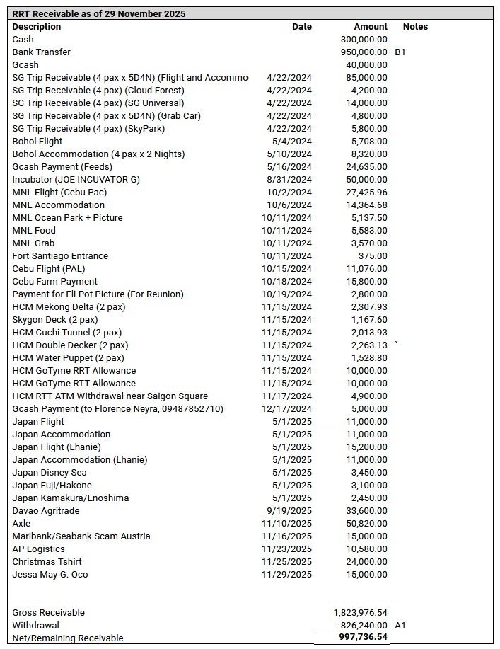 Receivable as of Nov 29, 2025